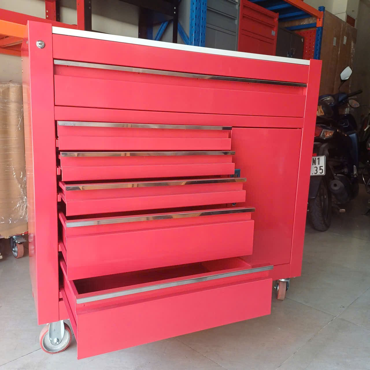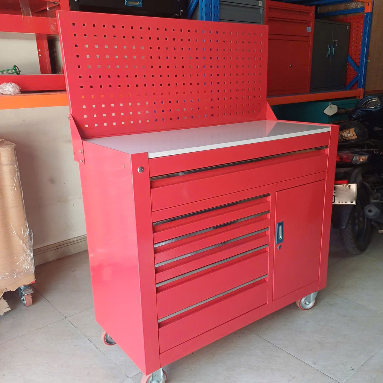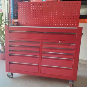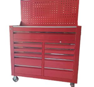 Tủ đồ nghề 11 ngăn kéo kết hợp bảng treocó bánh xe tiện di chuyển. Đây là loại tủ đựng đồ nghề thông dụng và được sử dụng nhiều trong các tiệm sửa chữa xe máy hay trung tâm bảo dưỡng, bảo trì ô tô hoặc tại các nhà máy, xưởng sản xuất. Tủ 11 ngăn được gia công chắc chắn và lắp rắp tại Việt Nam.