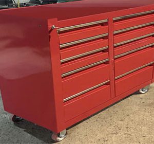 Tủ dụng cụ ngăn kéo, có bánh xe tiện di chuyển. Đây là loại tủ đựng đồ nghề thông dụng và được sử dụng nhiều trong các tiệm sửa chữa xe máy hay trung tâm bảo dưỡng, bảo trì ô tô hoặc tại các nhà máy, xưởng sản xuất. Tủ 10 ngăn được gia công chắc chắn và lắp rắp tại Việt Nam.