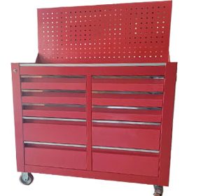 Tủ dụng cụ 10 ngăn kéo kết hợp bảng treo, có bánh xe tiện di chuyển. Đây là loại tủ đựng đồ nghề thông dụng và được sử dụng nhiều trong các tiệm sửa chữa xe máy hay trung tâm bảo dưỡng, bảo trì ô tô hoặc tại các nhà máy, xưởng sản xuất. Tủ được gia công chắc chắn và lắp rắp tại Việt Nam.