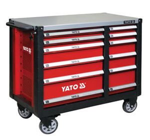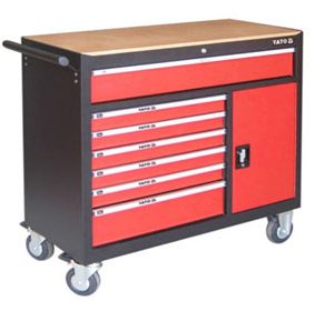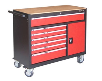 Tủ đựng đồ nghề 8 ngăn Yato YT-09141  thiết kế tiện dụng có 7 ngăn kéo, 1 ngăn 1 cánh cửa mở, có bánh xe tiện di chuyển và phía trên nắp tủ đặt một tấm ván để làm thành mặt bàn nguội thao tác ngay trên tủ rất tiện dụng cho quá trình sửa chữa.